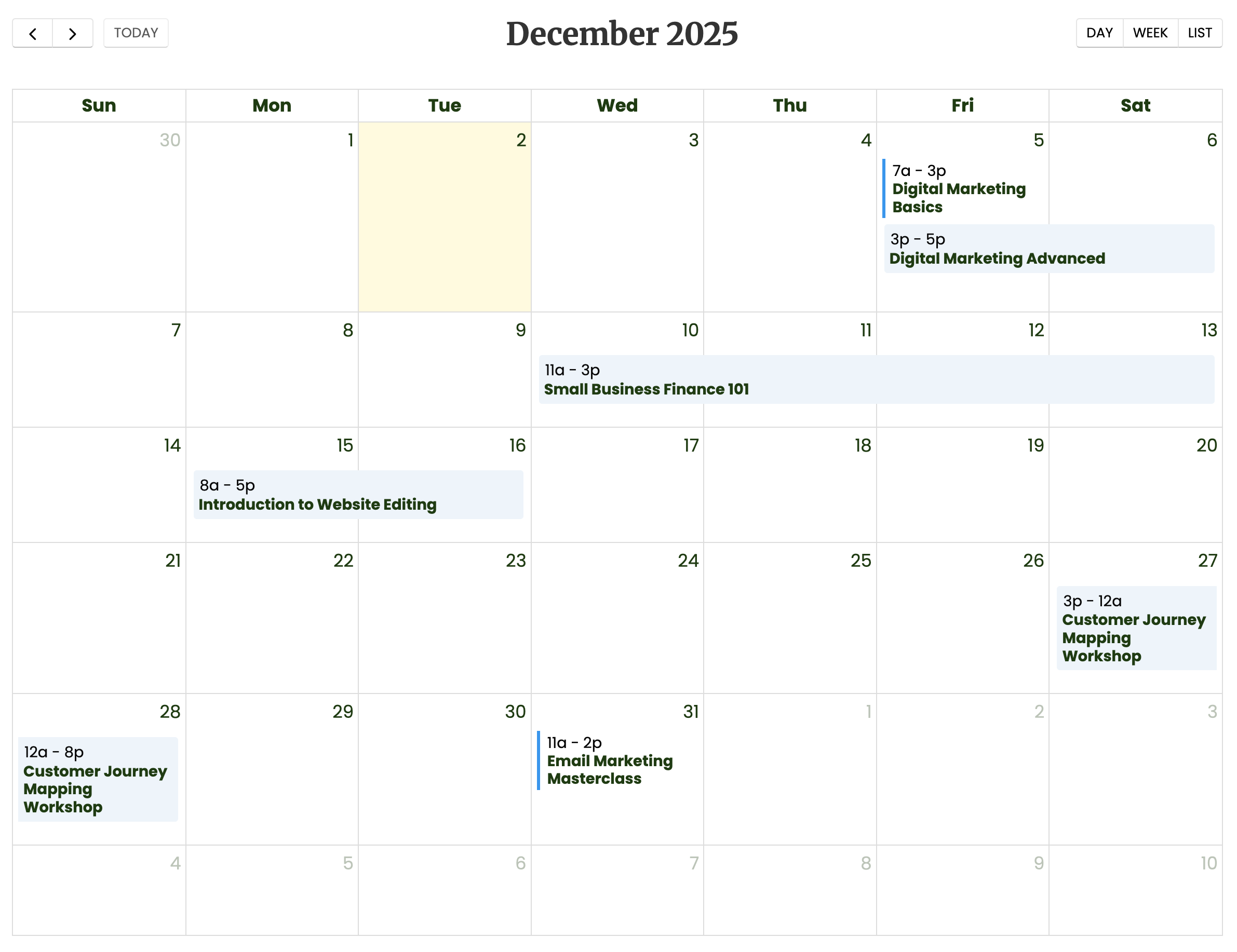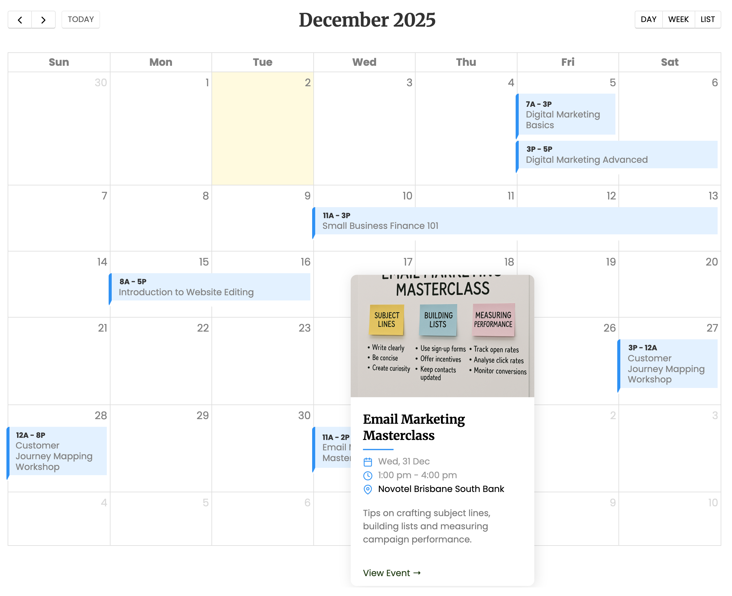 This calendar is ideal for events that have additional descriptions. A popup will appear to display further information by hovering over each event.