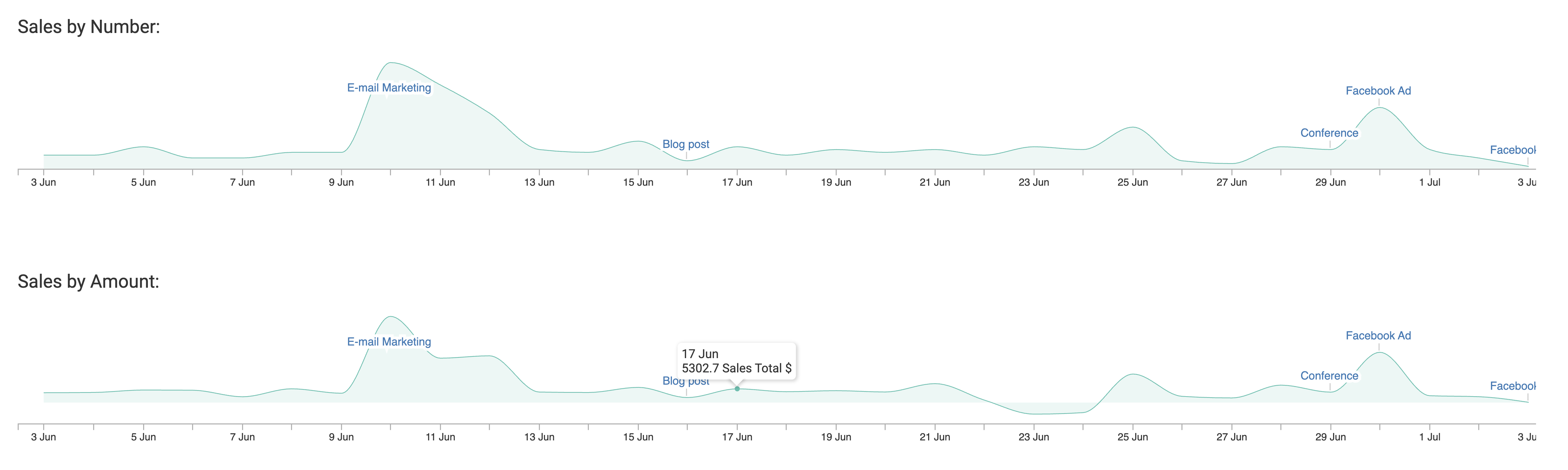 Notable marketing events like email campaigns, blog posts, conferences, or Facebook ads are annotated directly on the graph, making it easy to correlate promotions with sales spikes.