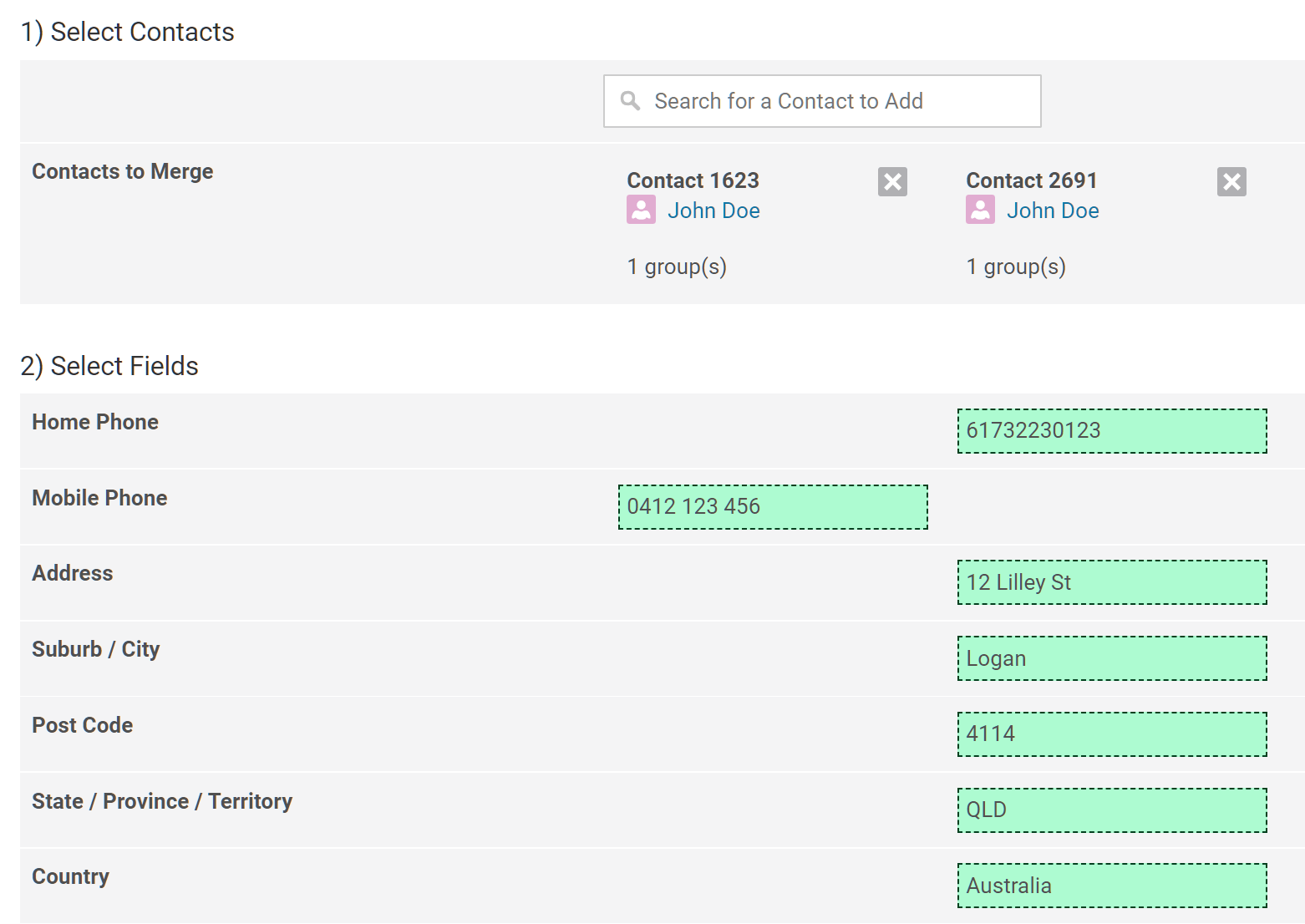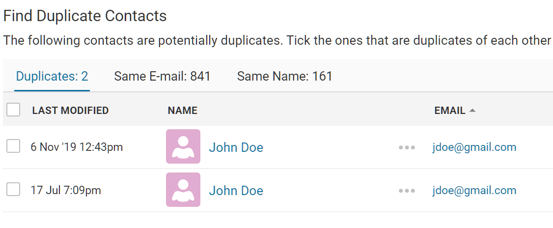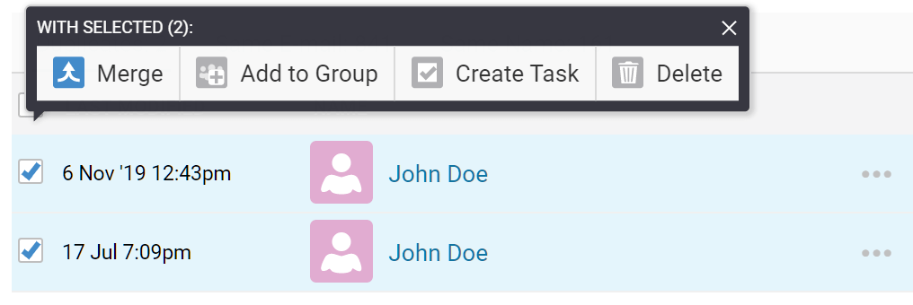Once you have identified two or more duplicate records, tick them on the left, then click Merge.
