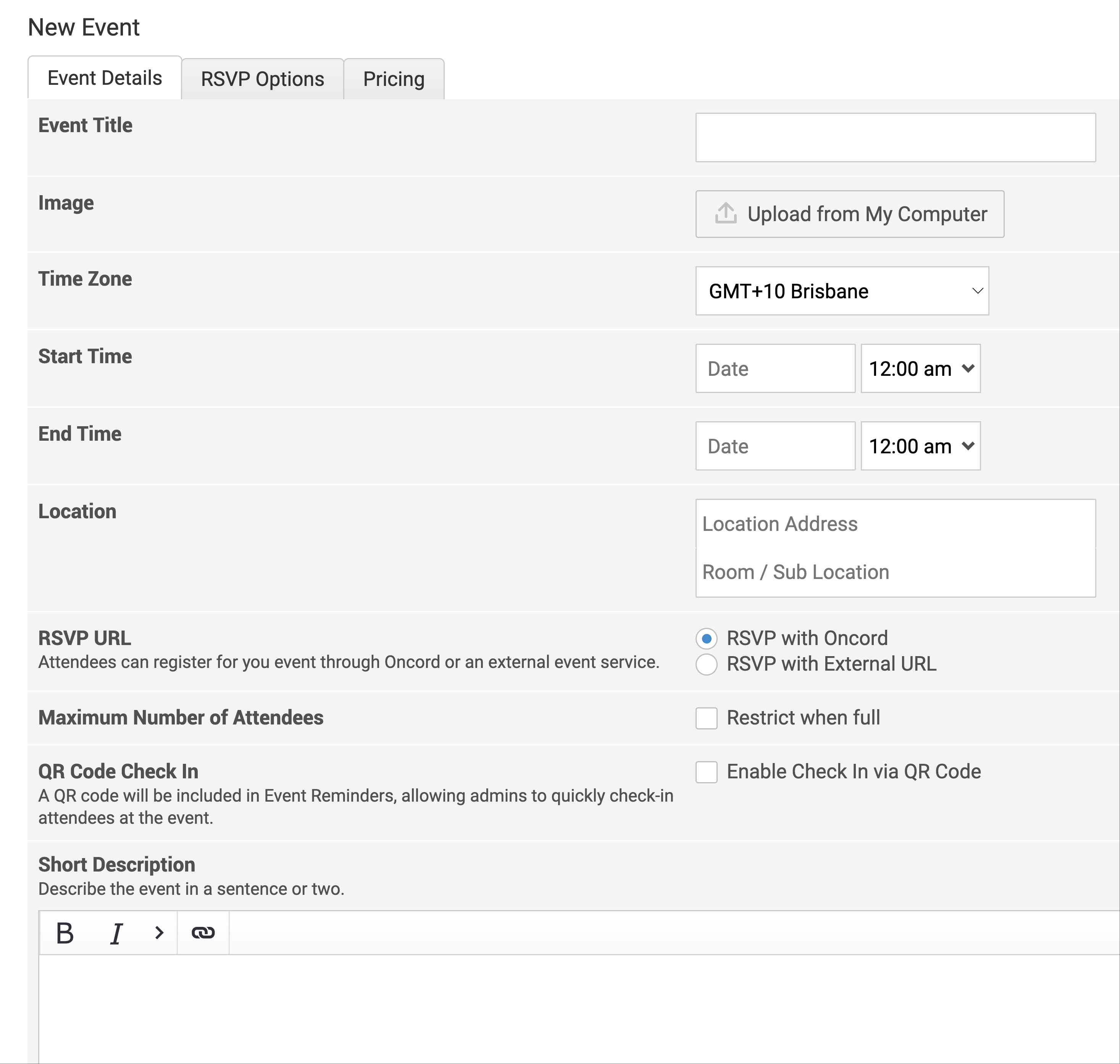 Require Address on Registration: To encourage event registration, by default Oncord will not ask attendees for their address. Tick this option to require the user to enter their address.