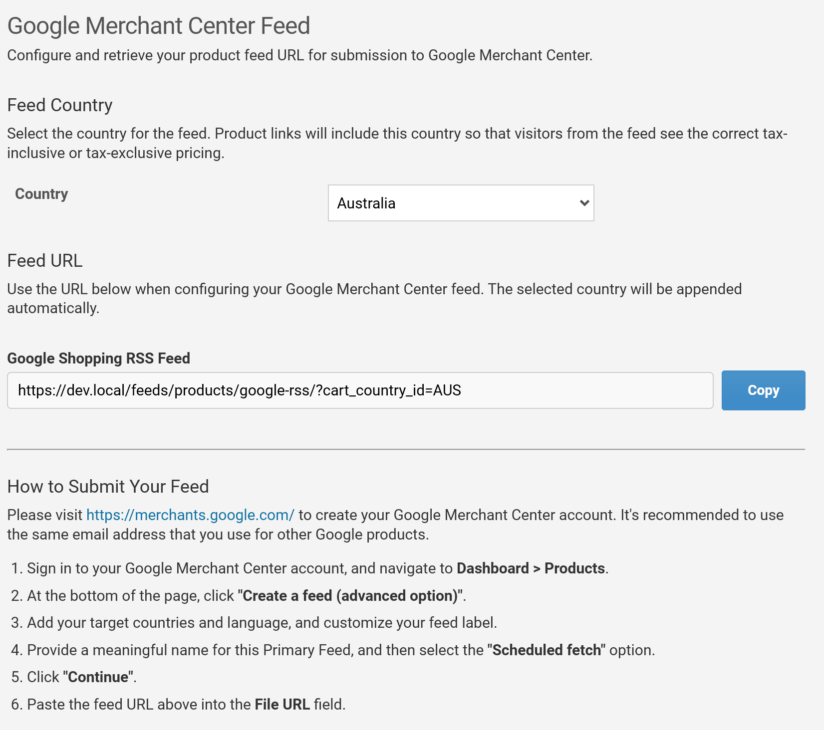 To get your feed URL, go to Commerce > Products > Google Merchant Center Feed in your admin panel. Select the